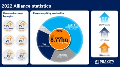 Praxity Global Alliance, крупнейший в мире альянс независимых бухгалтерских, налоговых и консалтинговых фирм, сообщил о рекордных доходах в размере 8,77 млрд долларов США при стабильном обменном курсе, что на 11,7% больше, чем в предыдущем году.